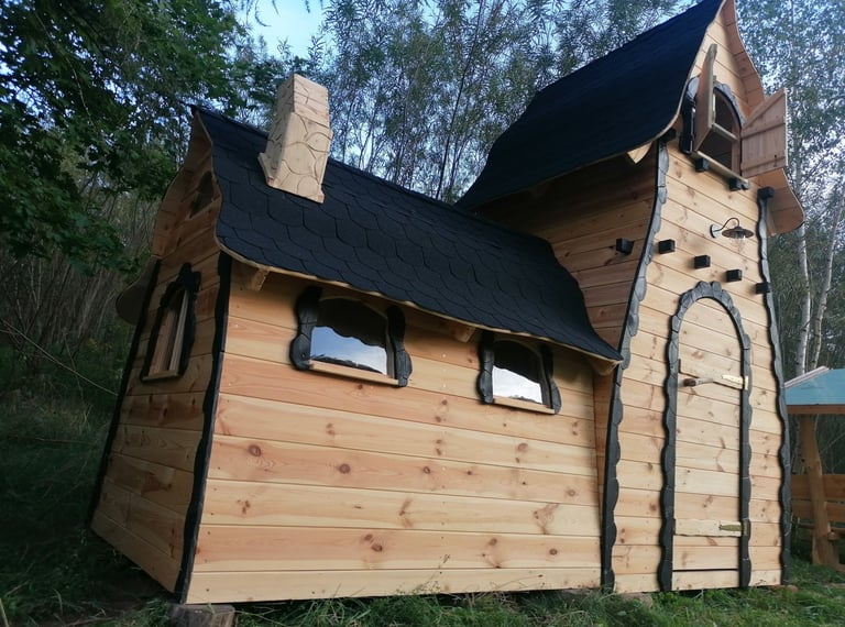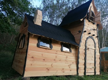 Wyjątkowa chatka dla dzieci z imponującą wieżą o wysokości 4 metrów i dwoma poziomami. Obok znajduje się przestronna jadalnia wyposażona we wszystko, co potrzebne do wspólnej zabawy. Dwuspadowy dach nadaje całości unikalny, magiczny charakter.