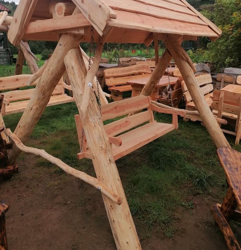 Wspaniały zestaw z drewna dębowego. Postarzany, wypalany i zachowany, nada charakteru każdemu ogrodowi.